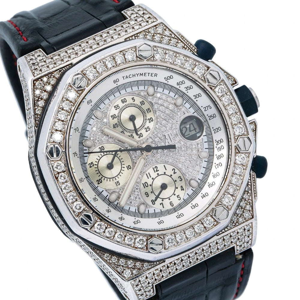 This premium iced out diamond chronograph watch for men designed to deliver a bold luxury statement. Crafted with a fully stone-studded case and dial, this watch reflects unmatched brilliance and elegance. The detailed chronograph sub-dials combined with a tachymeter scale give it a powerful and sporty appeal.