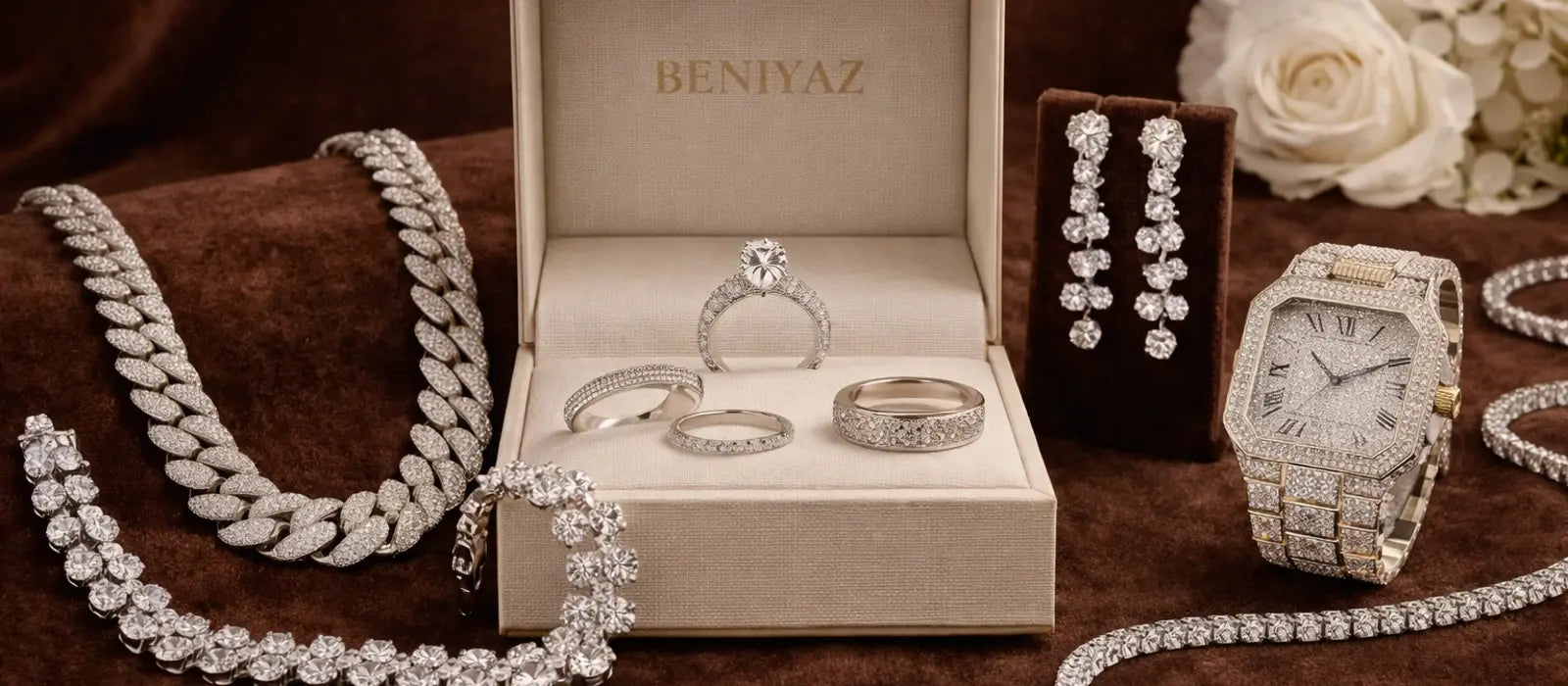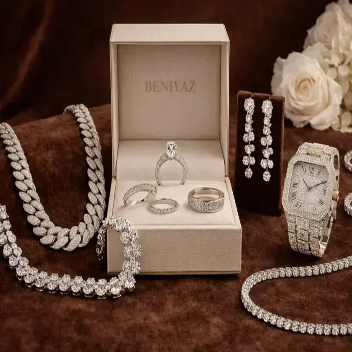 Discover Beniyaz signature designs — from timeless rings, radiant earrings, bold Cuban chains, elegant necklaces, to iced-out watches and statement hip hop jewelry. Crafted for those who demand luxury with an edge.